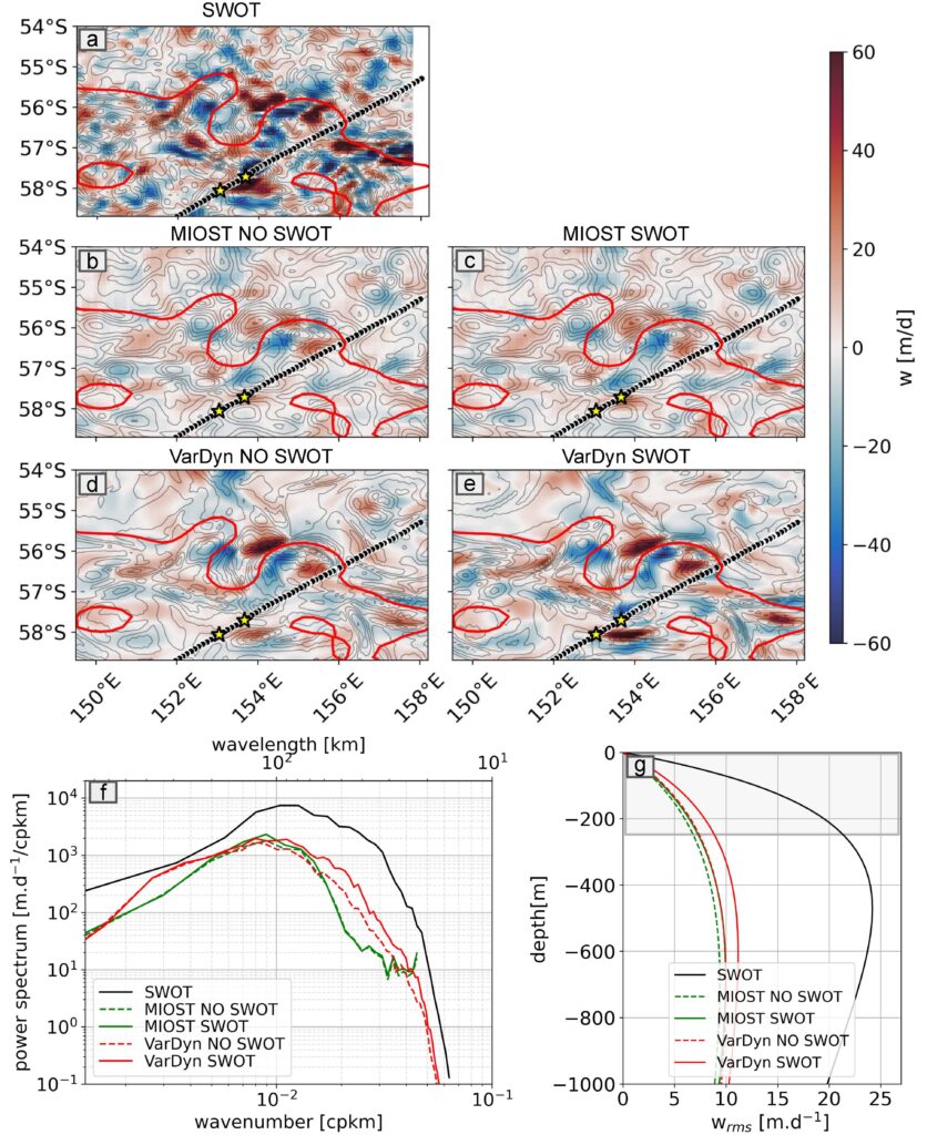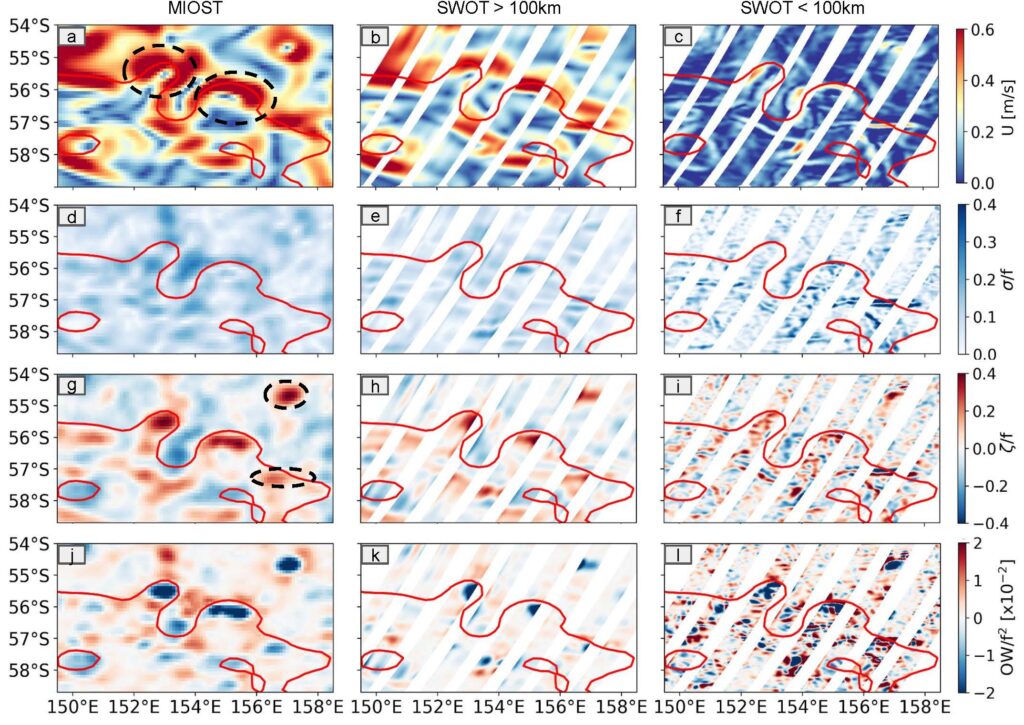 In this work we use key dynamical metrics to compare the contributions of the different structures to various ocean processes. While large scales dominate the overall flow, smaller scales significantly enhance the stretching and straining of currents, contributing to the increase of the vertical exchange amplitude between the ocean surface and its interior. To validate SWOT’s accuracy, we compare its small-scale observations with high-resolution temperature data collected during a 2023 research voyage. The results align well with subsurface temperature patterns.
